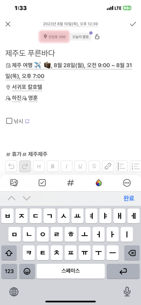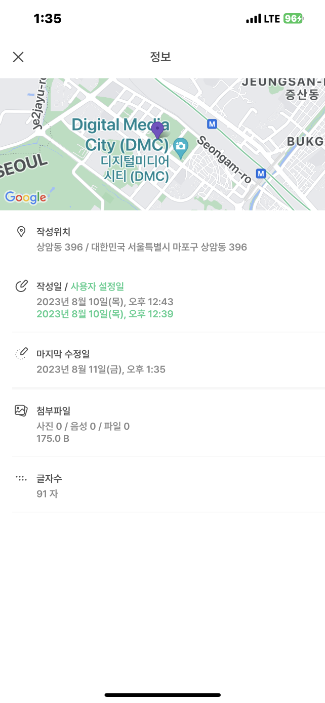작성된 페이지 하단의 정보 아이콘(i)을 탭하면 마지막 수정일, 작성 위치 등과 같은 자세한 정보를 확인할 수 있습니다. 또한, 페이지에 대한 메타데이터 및 관련 정보도 추가로 확인할 수 있습니다. 구체적으로 작성 위치, 작성일, 사용자 설정일, 마지막 수정일, 첨부파일 그리고 페이지 내 글자 수 등을 확인할 수 있습니다.