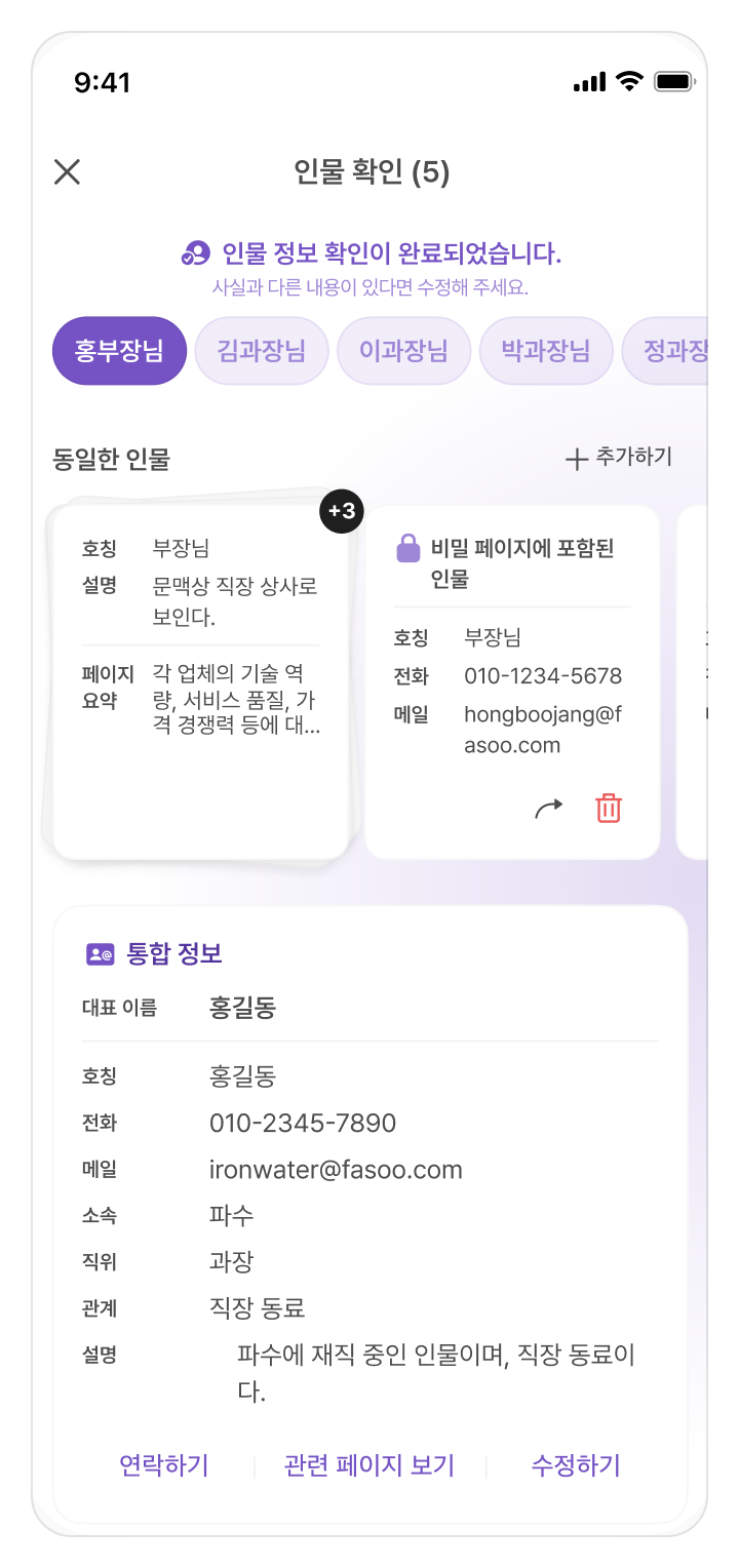회의 기록, 모임 사진, 인터뷰 자료처럼 여러 인물이 포함된 페이지에서는 인물이 자동으로 추출돼요.